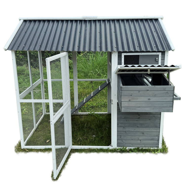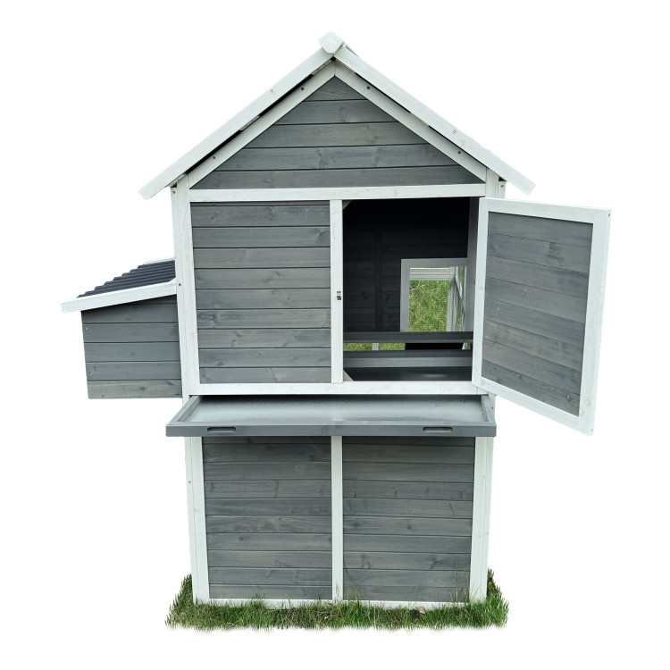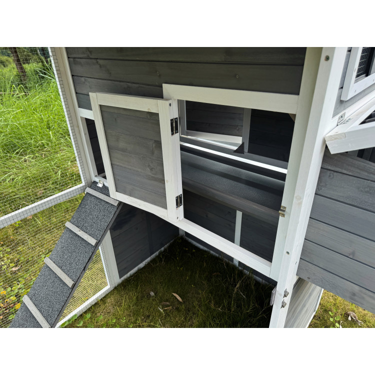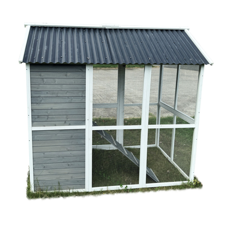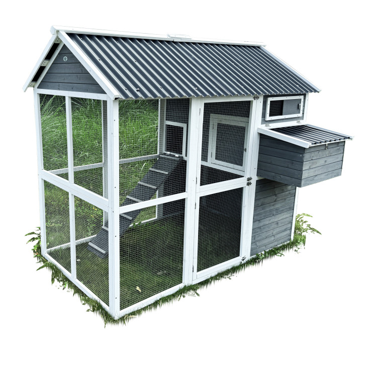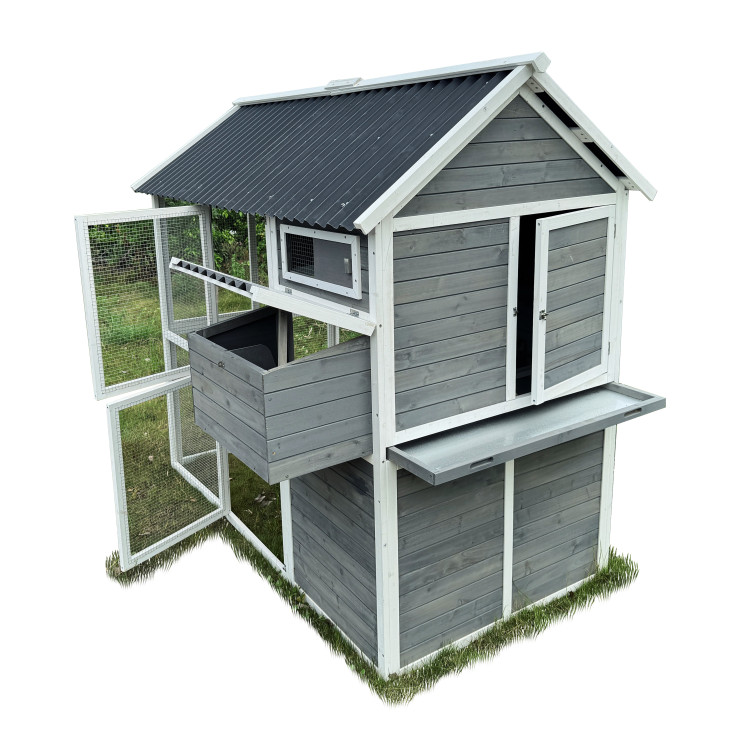 Kurník Bejrút je priestranný a elegantný prístrešok pre vaše sliepky, spája kvalitu, bezpečie a štýl . S rozmermi 196 × 141 × 180 cm poskytuje domov až pre 6 sliepok . Steny kurníka sú z masívneho dreva v kombinácii šedej a bielej farby , materiál strechy je vlnitý plast, ktorý úplne bezpečne chráni pred dažďom, snehom i horúcim slnkom. Súčasťou je aj veľký oplotený výbeh z pozinkovaného pletiva , kde majú sliepky dostatok priestoru na pohyb na čerstvom vzduchu a tráve. Vnútri kurníka sa nachádza hrad pre nočný odpočinok , rampa spájajúca obytnú časť s výbehom a bočné znáškové hniezdo s výklopnou strechou pre ľahký zber vajíčok. Jednoduchú údržbu zaisťuje výsuvný trusník (výsuvná podlaha). Zdraviu vašich sliepočiek prospeje v entilačné okienko s pletivom , ktoré zaisťuje prístup čerstvého vzduchu, ktorý je pre správne životné podmienky úplne nevyhnutný. Prístup dovnútra kurníka je jednoduchý vďaka veľkým dvierkam na prednej aj zadnej strane a bočným dverám do výbehu .